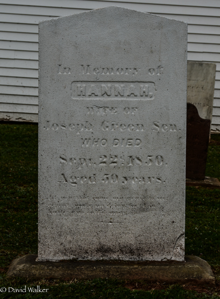Inscription: In Memory of / Hannah, / Wife of / Joseph Green Sen. / Who Died / Sept. 22, 1850, / Aged 50 years.3  Tombstone, Hannah Baker (c1800-1850). St. John's Anglican Cemetery, St. Eleanors, Prince County, Prince Edward Island, Canada.