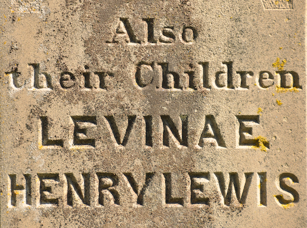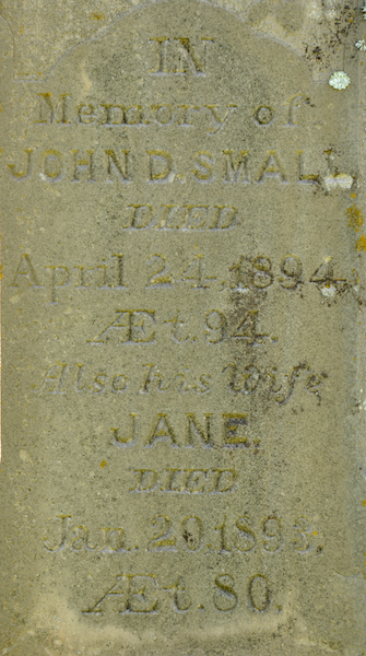 Inscription: In / Memory of / John D. Small / Died / April 24, 1894, / AEt. 94. / Also His Wife / Jane / Died / Jan 20, 1893/ AEt 80 / SMALL Back: Also / Their / Children / Levina E. / Henry Lewis.3  Tombstone, John Darby Small (1800-1894), his wife Jane Glover (1813-1893), their children Levina E. and Henry Lewis. St. John's Anglican Cemetery, St. Eleanors, Prince County, Prince Edward Island, Canada.  Front inscription detail.  Back inscription detail.