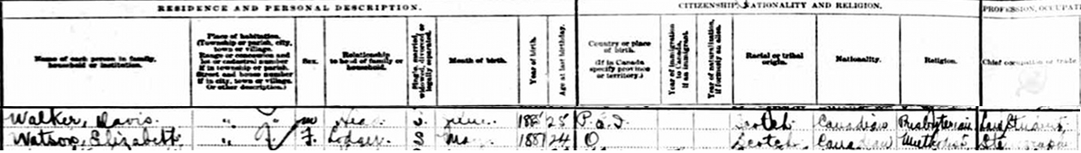 | Census | Davis Scott Walker was head of the household in the census in 1911 in Main St., North Battleford, Saskatchewan, CanadaG. Enumerated in the household with Davis was Elizabeth Watson, a lodger. Davis was single, and a law student.3 1911 Canada Census, North Battleford, Saskatchewan. Household of Davis Scott Walker. |