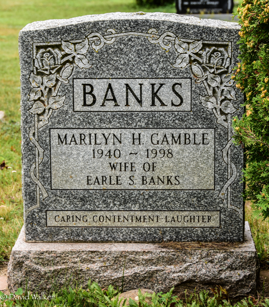 Inscription: BANKS / Marilyn H. Gamble / 1940 - 1998 / Wife of / Earle S. Banks / Caring, Contentment, Laughter.1  Tombstone, Marilyn H. Gamble (1940-1998). Central Lot 16 United Church Cemetery, Prince County, Prince Edward Island, Canada.