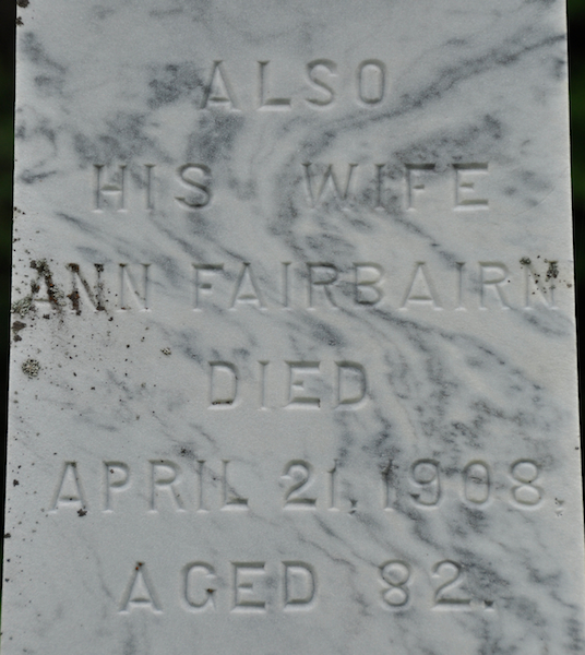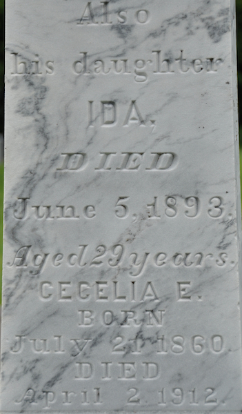 | Burial | She was buried in the United Church Cemetery, Cascumpec, Prince County, Prince Edward Island, Canada, 46.763644, -64.10778G. Inscription: In Memory Of / Thomas Clark / Died / Dec. 17, 1895, / Aged 74 years. / CLARK (on base)Left: Also / his daughter / Ida, / Died / June 5, 1893, Aged 29 years. / Cecelia E. / Born / July 21, 1860. / Died / April 2, 1912.Right: Also / his wife / Ann Fairbairn / Died / April 21, 1908, / Aged 82.Back: Chester W. Clark / Born / March 1, 1855, / Died / June 18, 1914. / His wife / Fannie A. Taylor / Born / June 17, 1863 / Died / Jan. 17, 1957.2 Tombstone, Thomas Clark, his wife Ann Fairbairn, daughters Ida & Cecelia, son Chester and his wife Fannie A. Taylor. United Church Cemetery, Cascumpec, Prince County, Prince Edward Island, Canada.  Front inscription detail.  Left inscription detail.  Right inscription detail.  Back inscription detail. |