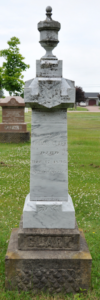 | Burial | He was buried in the United Church Cemetery, Cascumpec, Prince County, Prince Edward Island, Canada, 46.763644, -64.10778G. Inscription: In Memory Of / Thomas Clark / Died / Dec. 17, 1895, / Aged 74 years. / CLARK (on base)Left: Also / his daughter / Ida, / Died / June 5, 1893, Aged 29 years. / Cecelia E. / Born / July 21, 1860. / Died / April 2, 1912.Right: Also / his wife / Ann Fairbairn / Died / April 21, 1908, / Aged 82.Back: Chester W. Clark / Born / March 1, 1855, / Died / June 18, 1914. / His wife / Fannie A. Taylor / Born / June 17, 1863 / Died / Jan. 17, 1957.2 Tombstone, Thomas Clark, his wife Ann Fairbairn, daughters Ida & Cecelia, son Chester and his wife Fannie A. Taylor. United Church Cemetery, Cascumpec, Prince County, Prince Edward Island, Canada.  Front inscription detail.  Left inscription detail.  Right inscription detail.  Back inscription detail. |