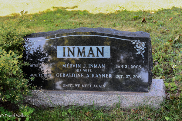 | Principal 2 | She witnessed the burial of Mervin J. Inman and Geraldine Amelia Rayner in the United Church Cemetery, Central Lot 16, Prince County, Prince Edward Island, Canada, 46.46653, -63.85735G.2![]() Tombstone, Mervin J. Inman (1913-2005), his wife Geraldine A. Rayner (1915-2015). Central Lot 16 United Church Cemetery, Prince County, Prince Edward Island, Canada. |