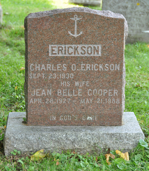 | Burial | She was buried in the Peoples Cemetery, Summerside, Prince County, Prince Edward Island, Canada, 46.40579, -63.77684G. Inscription: ERICKSON / Charles O. Erickson / Sept. 23, 1930 - / His Wife / Jean Belle Cooper / Apr. 28, 1927 - May 21, 1988 / In God's Care.1![]() Tombstone, Charles O. Erickson (1930- ), his wife Jean Belle Cooper (1927-1988). Peoples Cemetery, Summerside, Prince County, Prince Edward Island, Canada. |