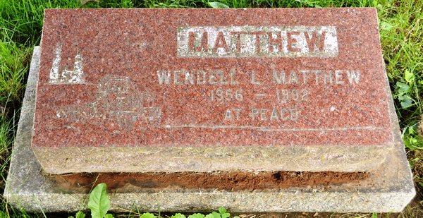 | Burial | He was buried in the Peoples Cemetery, Summerside, Prince County, Prince Edward Island, Canada, 46.40457, -63.77539G. Section H1, Row 4, Stone 572.Inscription: MATTHEW / Wendell L. Matthew / 1956 - 1992 / At Peace.1,2![]() Tombstone, Wendell L. Matthew (1956-1992). Peoples Cemetery, Summerside, Prince County, Prince Edward Island, Canada. |