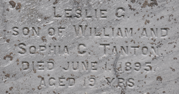 | Interred | He was buried in the plot of William Tanton, in St. John's Anglican Church Cemetery, St. Eleanors, Prince County, Prince Edward Island, 46.41958, -63.81017G. Inscription: In Memory of / William Tanton / Died May 21, 1911, / Aged 75. / Also His Wives / Sophia C. Jamieson / Died Apr. 30, 1883 / Aged 47 / Deborah Sharp / Died Dec. 17, 1909, / Aged 75 / TANTONBack: Leslie G. / Son of William and / Sophia C. Tanton / Died June 1, 1895, / Aged 19 yrs.5 ![]() Tombstone, William Tanton (1836-1911), his wives Sophia Craig Jamieson (1836-1883) & Deborah Sharp (1834-1909), and Leslie G. Tanton (1876-1895), son of William and Sophia Tanton. St. John's Anglican Church Cemetery, St. Eleanors, Prince County, Prince Edward Island, Canada. ![]() Front inscription detail ![]() Back inscription detail |