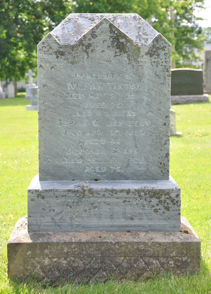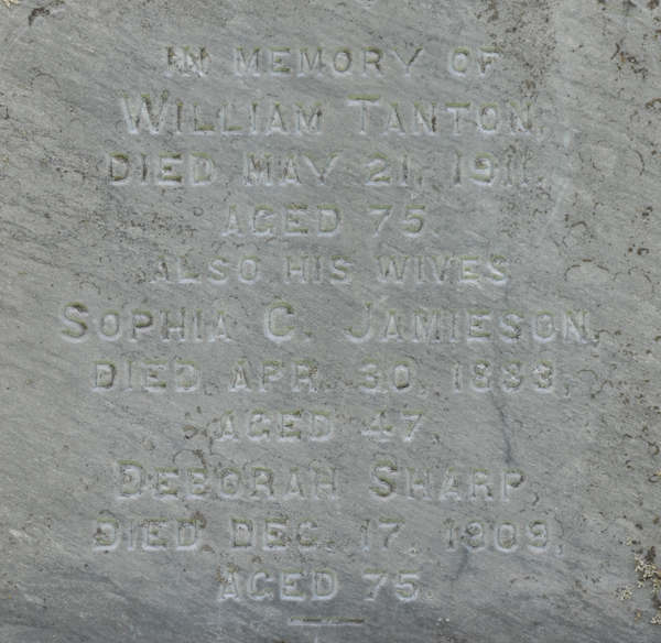 | Burial | He was buried in St. John's Anglican Church Cemetery, St. Eleanors, Prince County, Prince Edward Island, 46.41958, -63.81017G. Inscription: In Memory of / William Tanton / Died May 21, 1911, / Aged 75. / Also His Wives / Sophia C. Jamieson / Died Apr. 30, 1883 / Aged 47 / Deborah Sharp / Died Dec. 17, 1909, / Aged 75 / TANTONBack: Leslie G. / Son of William and / Sophia C. Tanton / Died June 1, 1895, / Aged 19 yrs.2 ![]() Tombstone, William Tanton (1836-1911), his wives Sophia Craig Jamieson (1836-1883) & Deborah Sharp (1834-1909), and Leslie G. Tanton (1876-1895), son of William and Sophia Tanton. St. John's Anglican Church Cemetery, St. Eleanors, Prince County, Prince Edward Island, Canada. ![]() Front inscription detail ![]() Back inscription detail |