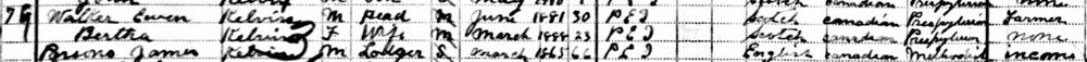 | Witness | Bertha Ella Douglas was enumerated on the census on 1 June 1911 in the household of Ewen MacGregor Walker in Lot 25, Kelvin, Prince County, Prince Edward Island, CanadaG. Included in the household were Ewen's wife Bertha (Douglas) and James Parsons, a lodger. The family religion was Presbyterian. Ewen was a farmer.2 1911 Canada Census, Lot 25, Kelvin, Prince Edward Island, household of Ewen Walker. Included in the household were Ewen's wife Bertha (Douglas) and James Parsons, a lodger. The family religion was Presbyterian. Ewen was a farmer |