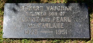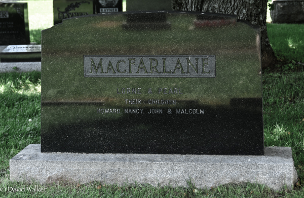 Inscription: MacFARLANE / Lorne & Pearl / Their Children / Howard, Nancy, John & MalcolmBack: MacFARLANE / Malcolm / MacFarlane / April 22, 1941 / Dec. 10, 2009 | Margaret / MacDougald / -------- / -------- // Married Sept. 10, 1966Flatstone: Pearl Hamill Vaughan / 1901 - 1998Flatstone: Lorne Herbert MacFarlane / 1904 - 1971Flatstone: Howard Vaughan / Beloved Son of / Lorne & Pearl / MacFarlane / 1928 - 1951Flatstone: John Alan MacFarlane / 1937 - 2002.1  Tombstone, Lorne Herbert MacFarlane (1904-1971), his wife Pearl Hamill Vaughan (1901-1998), their sons Malcolm MacFarlane (1941-2009), Howard Vaughan MacFarlane (1928-1971) and John Alan MacFarlane (1937-2002). Peoples Cemetery, Summerside, Prince County, Prince Edward Island, Canada.  Back inscription detail.  Flatstone: Pearl Hamill (Vaughan) MacFarlane (1901-1998).  Flatstone: Lorne Herbert MacFarlane (1904-1971).  Flatstone: Howard Vaughan MacFarlane (1928-1951).  Flatstone: John Alan MacFarlane (1937-2002).