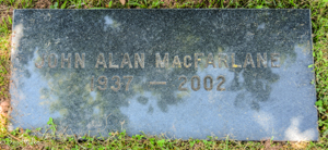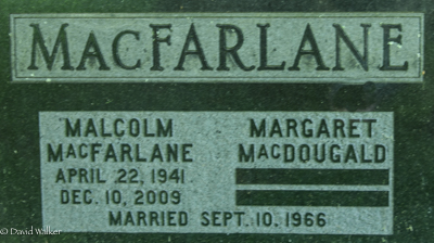 Inscription: MacFARLANE / Lorne & Pearl / Their Children / Howard, Nancy, John & MalcolmBack: MacFARLANE / Malcolm / MacFarlane / April 22, 1941 / Dec. 10, 2009 | Margaret / MacDougald / -------- / -------- // Married Sept. 10, 1966Flatstone: Pearl Hamill Vaughan / 1901 - 1998Flatstone: Lorne Herbert MacFarlane / 1904 - 1971Flatstone: Howard Vaughan / Beloved Son of / Lorne & Pearl / MacFarlane / 1928 - 1951Flatstone: John Alan MacFarlane / 1937 - 2002.2  Tombstone, Lorne Herbert MacFarlane (1904-1971), his wife Pearl Hamill Vaughan (1901-1998), their sons Malcolm MacFarlane (1941-2009), Howard Vaughan MacFarlane (1928-1971) and John Alan MacFarlane (1937-2002). Peoples Cemetery, Summerside, Prince County, Prince Edward Island, Canada.  Back inscription detail.  Flatstone: Pearl Hamill (Vaughan) MacFarlane (1901-1998).  Flatstone: Lorne Herbert MacFarlane (1904-1971).  Flatstone: Howard Vaughan MacFarlane (1928-1951).  Flatstone: John Alan MacFarlane (1937-2002).