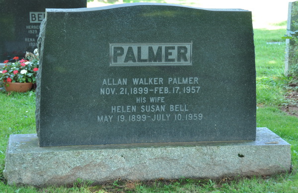 Inscription: PALMER / Allan Walker Palmer / Nov. 21, 1899 - Feb. 17, 1957 / His Wife / Helen Susan Bell / May 19, 1899 - July 10, 1959.1  Tombstone, Allan Walker Palmer (1899-1957), his wife Helen Susan Bell (1899-1959). Peoples Cemetery, Summerside, Prince County, Prince Edward Island, Canada.