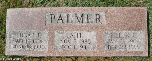 Inscription: PALMER / Edgar P. / Aug. 19, 1901 / June 16, 1990 | Faith / Nov. 2, 1935 / Dec. 1, 1936 | Helen C. / Jan. 29, 1904 / Dec. 22, 1999.3,1  Tombstone, Edgar P. Palmer (1901-1990), his wife Helen C. Clark (1904-1999), their daughter Faith (1935-1936). St. Peter's Anglican Church Cemetery, Foxley River, Prince County, Prince Edward Island, Canada.