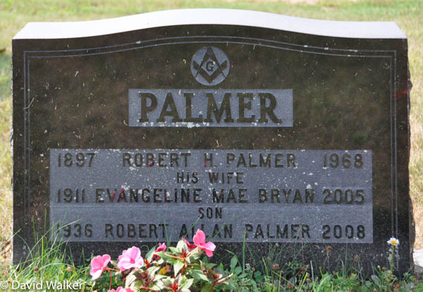 Inscription: PALMER / 1897 Robert H. Palmer 1968 / His Wife / 1911 Evangeline Mae Bryan 2005 / Son / 1936 Robert Allan Palmer 2008.1,4  Tombstone, Robert H. Palmer (1897-1968), his wife Evangeline Mae Bryan (1911-2005), their son Robert Allan (1936-2008). St. Peter's Anglican Church Cemetery, Foxley River, Prince County, Prince Edward Island, Canada.