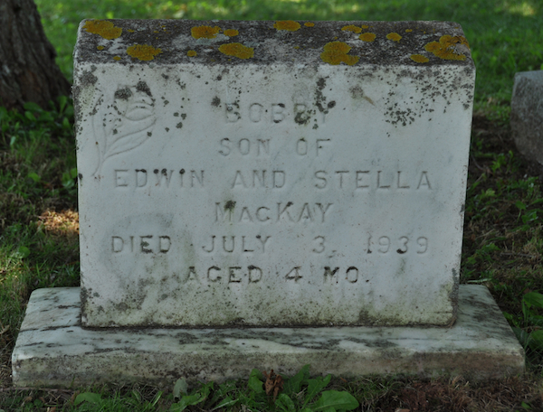 Inscription: Bobby / son of / Edwin and Stella / MacKay / Died July 3, 1939 / Aged 4 mo.1  Tombstone, Bobby MacKay (1939-1939). The Peoples Cemetery, Summerside, Prince County, Prince Edward island, Canada.