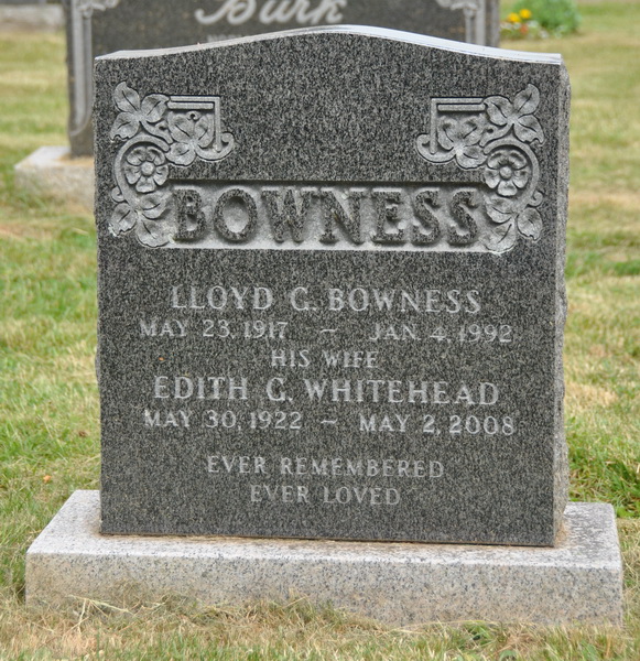 | Burial | She was buried on 7 May 2008 in the Peoples Cemetery, Summerside, Prince County, Prince Edward Island, Canada, 46.40501, -63.77542G. Inscription: BOWNESS / Lloyd G. Bowness / May 23, 1917 - Jan. 4, 1992 / His wife / Edith G. Whitehead / May 30, 1922 - May 2, 2008 / Ever remembered / Ever loved.2,3 ![]() Tombstone, Lloyd George Bowness (1917-1992), his wife Edith Whitehead (1922-2008). Peoples Cemetery, Summerside, Prince County, Prince Edward Island, Canada. |
