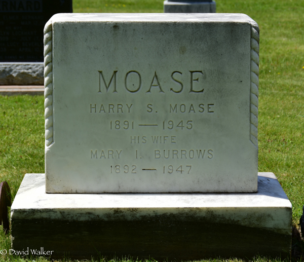 Inscription: MOASE / Harry S. Moase / 1891 - 1945 / His Wife / Mary I. Burrows / 1892 - 1947.4,2  Cemetery marker, Harry S. Moase (1891-1945), his wife Mary I. Burrows (1892-1947). Peoples Cemetery, Kensington, Prince County, Prince Edward Island, Canada.