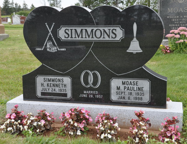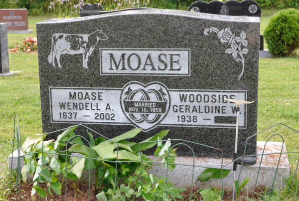 Inscription: MOASE / Moase / Wendell A. / 1937 - 2002 | Married / Nov. 15, 1958 | Woodside / Geraldine W. / 1938 -.2  Tombstone, Wendell A. Moase (1937-2002), his wife Geraldine Woodside (1938- ). Peoples Cemetery, Kensington, Prince County, Prince Edward Island, Canada.