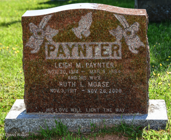 Inscription: PAYNTER / Leigh M. Paynter / Nov. 30, 1914 - Mar 5, 1994 / And His Wife / Ruth L. Moase / Nov. 3, 1917 - Nov. 26, 2009 / His Love Will Light the Way.1,3  Marker, Leigh M. Paynter (1914-1994), his wife Ruth L. Moase (1917-2009). St. Stephen's Anglican Cemetery, Irishtown, Queens County, Prince Edward Island, Canada.
