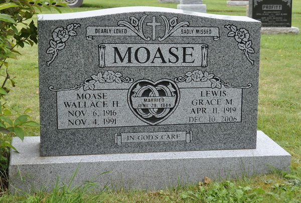 | Burial | He was buried in the Peoples Cemetery, Kensington, Prince County, Prince Edward Island, Canada, 46.44815, -63.62875G. Inscription: Dearly Loved, Sadly Missed / MOASE / Moase / Wallace H. / Nov. 6, 1916 / Nov. 4, 1991 | Married June 29, 1944 | Lewis / Grace M. / Apr. 11, 1919 / Dec. 10, 2006 / In God's Care.2,3 Tombstone, Wallace Moase (1916-1991), his wife Grace Lewis (1919-2006). Peoples Cemetery, Kensington, Prince County, Prince Edward Island, Canada. |