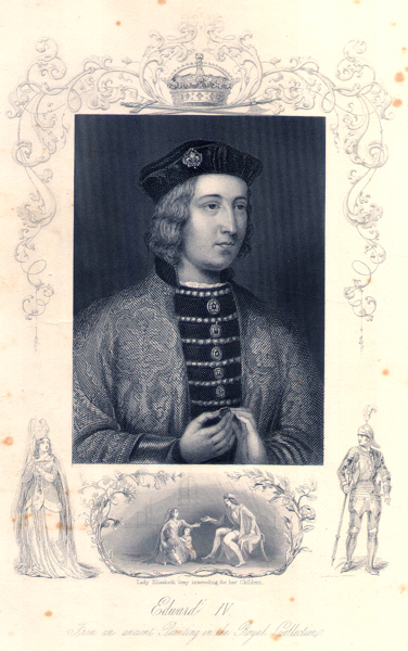 | Marriage | He married Elizabeth Woodville daughter of Richard Woodville, 1 st Earl Rivers, and Jacquetta of Luxembourg, on 1 May 1464, in her family home, Grafton Regis, Northamptonshire, EnglandG. She was a widow, and not of noble blood, the first commoner to marry an English sovereign.2,3 |
