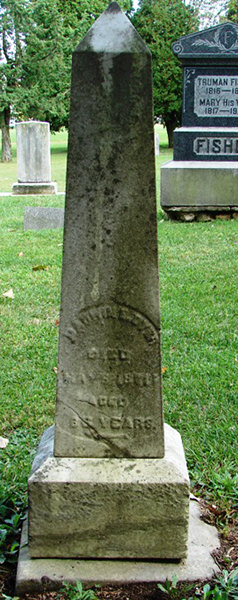 Inscription: Darwin E. Dyer / Died / May 5, 1871 / Aged 65 years.2  Tombstone, Darwin Erasmus Dyer (1805-1871). Old Brighton Cemetery, Brighton, Lorain County, Ohio, U.S.A.  Inscription detail.