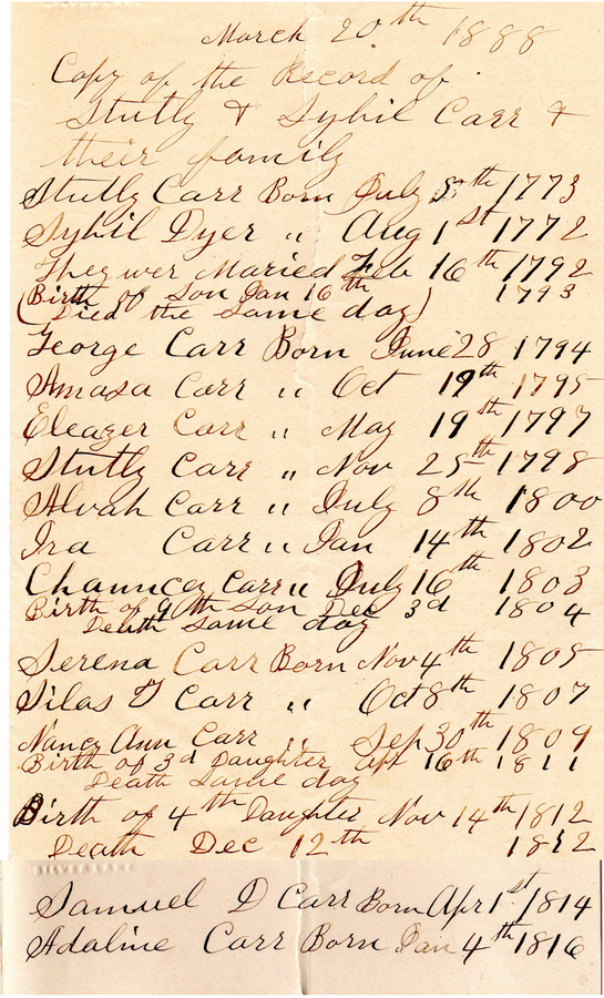 | Birth | Alvah Carr was born on 8 July 1800.3,4 Webber Family Bible. BMD entries written 20 March 1888. Courtesy of Randa Simmons. |