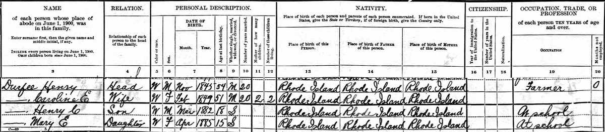 | Witness | He was enumerated on the census on 5 June 1900 in the household of Henry Durfee in Tiverton, Newport county, Rhode Island, USAG. included in the household with Henry (age 54) were his wife Caroline Cory (age 51), son Henry (age 18) and daughter Mary (age 15). Henry was a farmer. Both children were at school.2 1900 US Census, Tiverton, Newport County, Rhode island. Household of Henry Durfee, his wife Caroline, son Henry, daughter Mary. |