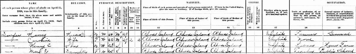| Witness | Henry Cory Durfee was enumerated on the census on 28 April 1910 in the household of Henry Durfee in Tiverton, Newport county, Rhode Island, USAG. included in the household with Henry (age 64) were his wife Caroline Elizabeth Cory (age 62), son Henry Cory Durfee (age 28) and daughter Mary (age 25). Henry Sr. was a general farmer, Henry Jr. a labourer on the home farm, and Mary a public school teacher.3 1910 US Census, Tiverton, Newport County, Rhode island. Household of Henry Durfee, his wife Caroline, son Henry, daughter Mary. |