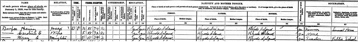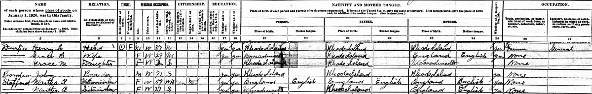 | Census | Henry Cory Durfee was head of the household in the census Between 16 January 1920 and 19 January 1920 in Tiverton, Newport county, Rhode Island, USAG. they were in the house adjacent to Henry's parents & sister. Included in the household with Henry (age 37) were his wife Grace (age 29), daughter Grace (age 2), mother-in-law Martha A. Stafford (age 59), sister-in-law Martha A. Stafford (age 27), and John Borden (age 71), a boarder. Henry's occupation was listed as a general farmer.5 1920 US Census, Tiverton, Newport County, Rhode island. Household of Henry Cory Durfee, his wife Grace, daughter Grace, mother-in-law Martha Stafford (mother of Grace), sister-in-law Martha Stafford (sister of Grace), John Borden, a boarder. |