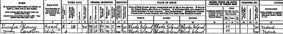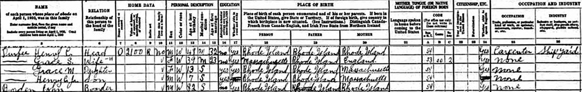 | Census | He was head of the household in the census on 2 April 1930 in Tiverton, Newport county, Rhode Island, USAG. included in the household with Henry (age 48) were his wife Grace Stafford (age 39), daughter Grace (age 13) and son Henry (age 7). A boarder, John Borden (age 82), was also in the household. Henry was a carpenter, working in a shipyard.4 1930 US Census, Tiverton, Newport County, Rhode island. Household of Henry Cory Durfee, his wife Grace, daughter Grace and son Henry. |
