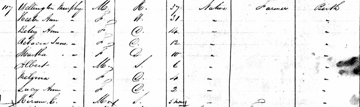 | Witness | She was enumerated on the census in 1851 in the household of Wellington Murphy in Andover, Victoria County, New BrunswickG. included in the household with Wellington (age 37) were his wife Hester Ann (age 31), and their children Betsy Ann (age 14), Rebecca Jane (age 12), Martha (age 10), Albert (age 6), Melvina (age 4), Lucy Ann (age 2) and Hiram E. (age 5 months). Wellington was a farmer.2 1851 Census of Canada East, Canada West, New Brunswick and Nova Scotia. Andover, Victoria County, New Brunswick. Household of Wellington Murphy, his wife Hester Ann, their children Betsy Ann, Rebecca Jane, Martha, Albert, Melvina, Lucy Ann and Hiram. |