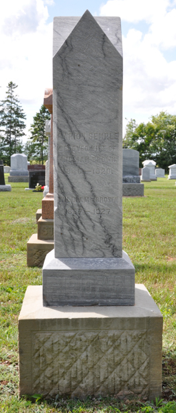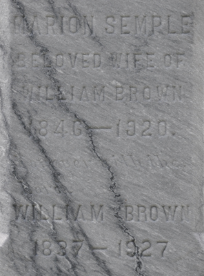| Burial | He was buried in the Peoples Cemetery, Kensington, Prince County, Prince Edward Island, Canada, 46.44767, -63.62861G. Inscription: Marion Semple / Beloved Wife of / William Brown / 1846 - 1920 / Forever with the / Lord / William Brown / 1837 - 1927 / BROWN.4 Tombstone, William Brown (1837-1927), his wife Marion Semple (1846-1920). Peoples Cemetery, Kensington, Prince County, Prince Edward Island, Canada.  Front inscription detail. |