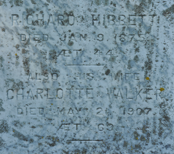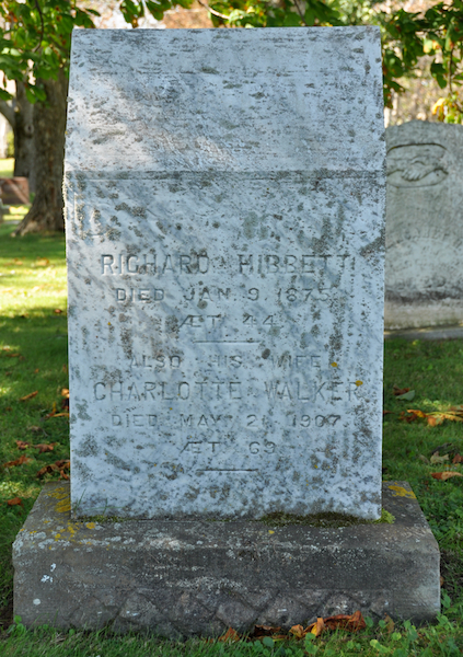 Inscription: Richard Hibbett / Died Jan 9, 1875 / AET. 44 / -- / Also His Wife / Charlotte Walker / Died May 21, 1907 / AET. 69.1  Tombstone, Richard Hibbett (1831-1875), his wife Charlotte Walker (1838-1907). St. John's Anglican Church Cemetery, St. Eleanors, Prince County, Prince Edward Island, Canada.  Front inscription detail.