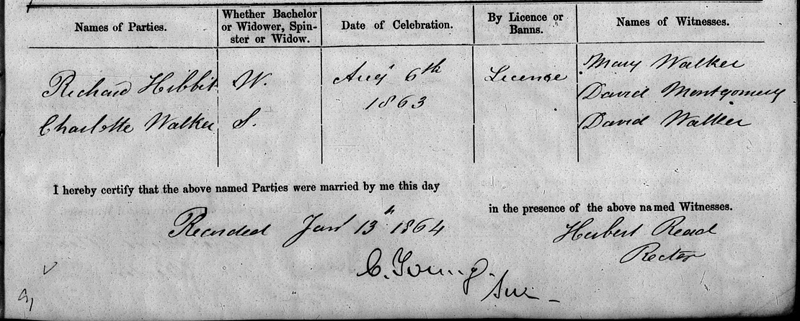 | Marriage | He married Charlotte Walker daughter of David Walker, Jr., and Janet Glover, on 6 August 1863, in Kensington, Prince County, Prince Edward IslandG. "Richard Hibbett (W)Charlotte Walker (S)marr. 6 Aug. 1863 by license, by Herbert Read, Rector.Wit. Mary & David Walker, David MontgomeryRecorded 13 Jan. 1864, C. Irving, surrogate" (Marriage Book #8, 1862-1867, p. 87)Richard Hibbett of Summerside and Charlotte Walker of Lot 19, were married by license at Kensington Lot 19, on Thursday Aug. 6th 1863, by me Herbert Read, D.D. Witnesses Elizabeth Ellis, Robert Ellis."2,3,1 Marriage Registration, Richard Hibbett and Charlotte Walker. |