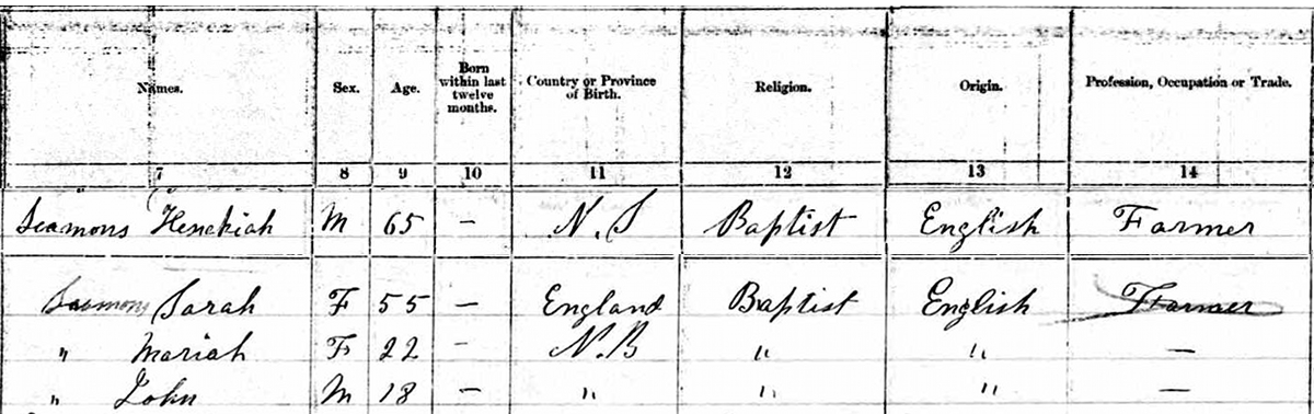 | Census | He was head of the household in the census in 1871 in Moncton, Westmorland County, New BrunswickG. included in the household with Hezekiah (age 65) were his wife Sarah (age 55), daughter Mariah (age 22) and son John (age 18). Hezekiah was a farmer. The family religion was Baptist.7![]() 1871 Canada Census, Moncton, Westmorland County, New Brunswick. Household of Hezekiah Seaman, his wife Sarah Jane Gibson, their daughter Maria/Mariah, and son John. |