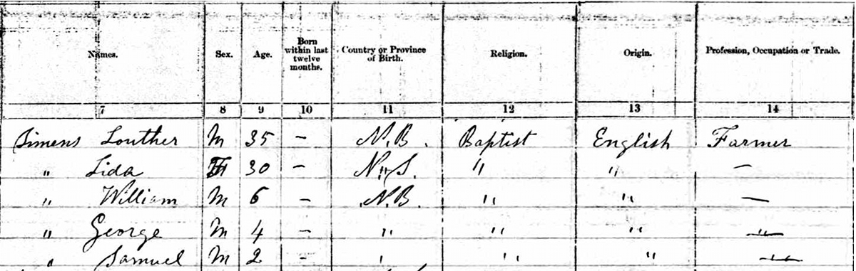 | Witness | He was enumerated on the census on 7 April 1871 in the household of Stephen Palmer in Parish of Hampstead, Queens County, New Brunswick, CanadaG. Included in the household were Stephen's wife Mary (Sanbourne), and sons Edwin, Harry and James. Stephen's occupation was listed as farmer. The family religion was Free Christian Baptist.2![]() 1871 Census, Parish of Hampstead, Queens County (District 177), New Brunswick. Household #85, Stephen Palmer. Included in the household were Stephen's wife Mary (Sanbourne), and sons Edwin, Harry and James. Stephen's occupation was listed as farmer. The family religion was Free Christian Baptist. |