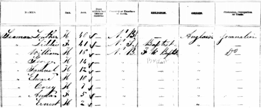 | Witness | He was enumerated on the census on 29 April 1891 in the household of William Hazen Brown in Moncton, Westmorland County, New Brunswick, CanadaG. included in the household with Hazen (age 44) were his wife Arbina Lockhart (age 38), children Ernest (age 16), Frank (age 14), Fannie (age 11), Bella/Della (age 7), Albert (age 5), Charles (age 3) & Seymore (age 5 months), and Hazen's father Thomas (age 83), now widowed. Hazen was a farmer, Ernest a book binder. The family religion was Methodist.6![]() 1891 Canada Census, Moncton, Westmorland County, New Brunswick. Household of William 'Hazen' Brown, his wife Arbina Lockhart, their children Ernest, Frank, Fannie, Bella, Albert, Charles & Seymore, and James, widowed father of Hazen. |