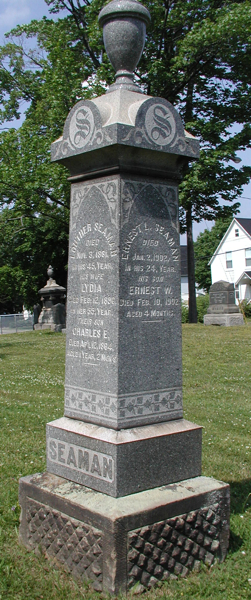| Burial | He was buried in Elmwood Cemetery, Moncton, Westmorland County, New Brunswick, Canada, 46.106200, -64.775033G. Inscription: Jacob Seaman / 1835-1915 / Mary A. Trites / His Wife / 1841-1928 / Children / John L. 1866-1870 / Pearl S. 1874-1875. / SEAMAN.Right Side: Ida M. Seaman / Wife of / A.J. Forbes / 1861-1896. There is a set of flat stones in front of the main tombstone, from left to right, Ida - Pearl - Father - Mother - John.10 ![]() Tombstone, Jacob Seaman (1835-1915), his wife mary Ann Trites (1841-1928), children John (1866-1870), Pearl (1874-1875) and Ida (1861-1896). Elmwood Cemetery, Moncton, Westmorland County, New Brunswick, Canada. ![]() Front inscription detail. ![]() Right inscription detail. |