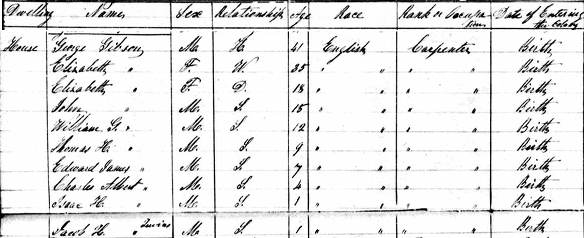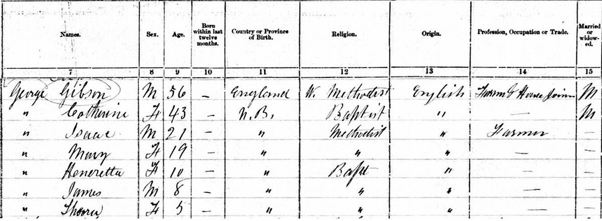 | Witness | He was enumerated on the census in 1851 in the household of George Gibson in Moncton, Westmorland County, New Brunswick, CanadaG. included in the household with George (age 41) were his wife Elizabeth Henderson (age 35), children Elizabeth (age 18), John (age 15), William (age 12), Thomas (age 9), Edward James (age 7), Charles Albert (age 4) and twins Isaac & Jacob (age 1). George was a carpenter.2 1851 Canada Census, Moncton, Westmorland County, New Brunswick. Household of George Gibson, his wife Elizabeth Henderson, children Elizabeth, John Henderson, William, Thomas, Edward James, Charles Albert, and twins Isaac & Jacob. |