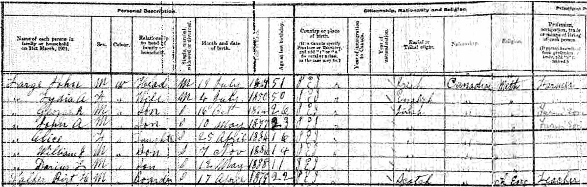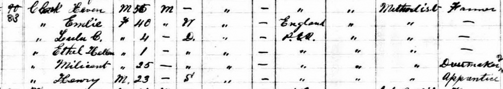 | servant | Reuben Sprague Allen was enumerated on the census in 1901 in the household of Christopher Lowther, as a servant, in Lot 27, Prince County, Prince Edward Island, CanadaG.3 |