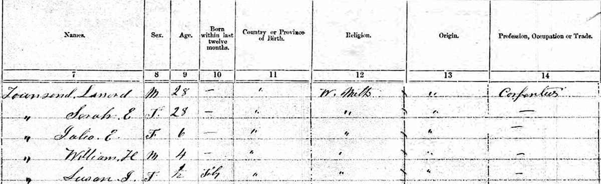 | Witness | He was enumerated on the census in March 1871 in the household of Leonard Townsend in River Philip, Cumberland County, Nova ScotiaG. included in the household with Leonard (age 28) were his wife Sarah Boss (age 28), and children Julia (age 6), William (age 4) and Susan (age 1 month). Leonard was a carpenter. The family religion was Wesleyan Methodist.2 1871 Canada Census, River Philip, Cumberland County, Nova Scotia. Household of Leonard Townsend, his wife Sarah Elizabeth Boss, and their children Julia, William and Susan. |