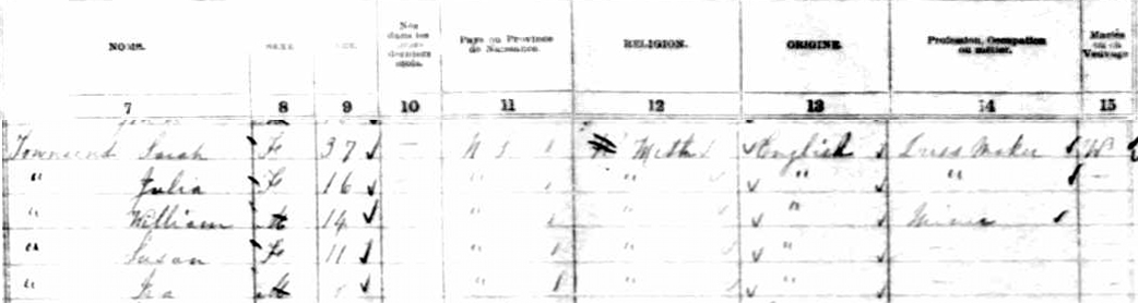| Census | She was head of the household in the census in 1881 in Maccan, Cumberland County, Nova Scotia, CanadaG. included in the household with widowed Sarah (age 37) were her children Julia (age 16), William (age 14), Susan (age 11) and Ira (age 8). Sarah and Julia were both dressmakers. William was a young miner. The family religion was Methodist.4 1881 Canada Census, Maccan, Cumberland County, Nova Scotia. Household of Sarah (Boss) Townsend and her children, Julia, William, Susan and Ira. |