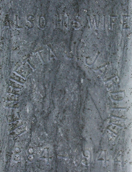 rectangular grey tombstone. Inscription: Peace Perfect Peace / Jane Walker / Wife of / J.M. Laird / 1855-1927 / John Melbourne Laird / 1870-1940 /. Right: Also his wife / Henrietta J. Jardine / 1884-1944.1  Tombstone, John M. Laird (1870-1940) and Jane Walker (1854-1927), the Peoples Cemetery, Kensington, Prince County, Prince Edward Island, Canada. This is the right inscription detail.