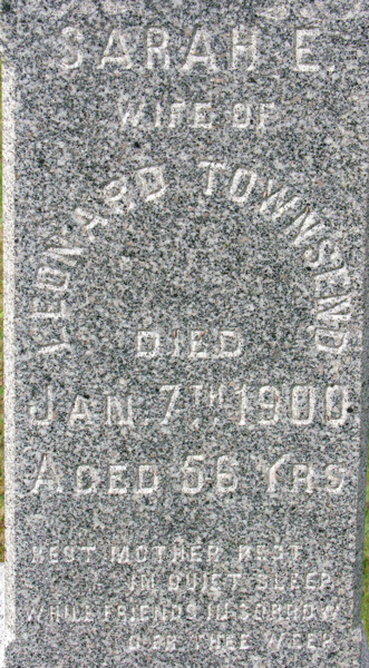 | Burial | She was buried in Hillside Cemetery, Springhill, Cumberland County, Nova Scotia, Canada, 45.656567, -64.033400G. square grey granite obelisk (top ornament fallen, lying next to base). Inscription: Leonard Townsend / Died / April 15 1876 / Aged 35 Yrs / William / His Son Died / in Montana / Aged 23 Yrs. Left Side: Blank. Right Side: Sarah E. / Wife of / Leonard Townsend / Died / Jan. 7th, 1900 / Aged 56 Yrs / Rest Mother Rest / In Quiet Sleep / While Friends in Sorrow / O'er Thee Weep.5 Tombstone, Leonard Townsend (ca.1841-1876), his wife Sarah Boss (1844-1900), their son William (1867-1890). Hillside Cemetery, Springhill, Cumberland County, Nova Scotia, Canada.  Front inscription detail.  Right inscription detail. |
