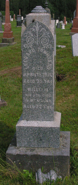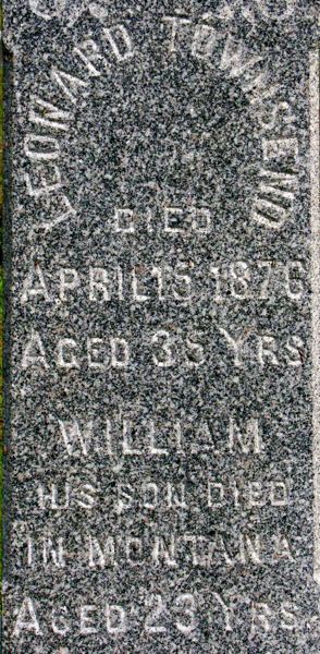 | Burial | He was buried in Hillside Cemetery, Springhill, Cumberland County, Nova Scotia, Canada, 45.656567, -64.033400G. square grey granite obelisk (top ornament fallen, lying next to base). Inscription: Leonard Townsend / Died / April 15 1876 / Aged 35 Yrs / William / His Son Died / in Montana / Aged 23 Yrs. Left Side: Blank. Right Side: Sarah E. / Wife of / Leonard Townsend / Died / Jan. 7th, 1900 / Aged 56 Yrs / Rest Mother Rest / In Quiet Sleep / While Friends in Sorrow / O'er Thee Weep.5 Tombstone, Leonard Townsend (ca.1841-1876), his wife Sarah Boss (1844-1900), their son William (1867-1890). Hillside Cemetery, Springhill, Cumberland County, Nova Scotia, Canada.  Front inscription detail.  Right inscription detail. |