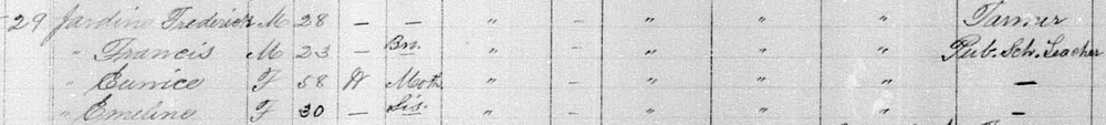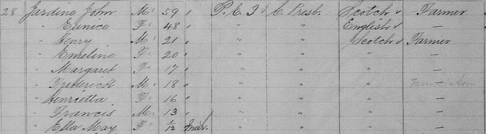 | Census | Ewen Frederick Jardine was head of the household in the census on 9 April 1891 in Lot 39, Kings County, Prince Edward Island, CanadaG. included in the household were Frederick's brother Francis, sister Emeline and mother Eunice (Clark). Frederick was a farmer, Francis a public school teacher. The family religion was Presbyterian.4 1891 Canada Census, Frederick Jardine, his brother Francis, dister Emeline and mother Eunice (Clark). |