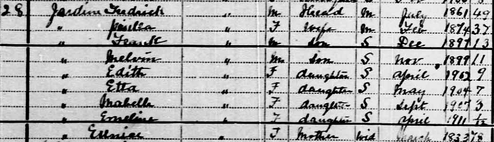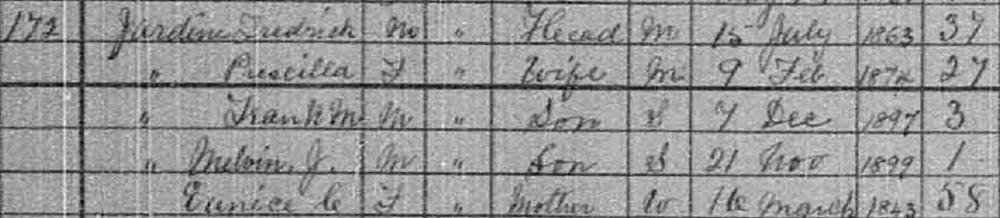 | Census | He was head of the household in the census on 1 June 1911 in Lot 39, Kings County, Prince Edward Island, CanadaG. included in the household were Frederick's wife Pricilla, sons Frank & Melvin, daughters Edith, Etta, Mabella, Emeline and mother Eunice (Clark).6 1911 Canada Census, Frederick Jardine, Lot 39, Kings County, Prince Edward Island, Canada. Included in the household were Frederick's wife Pricilla, sons Frank & Melvin, daughters Edith, Etta, Mabella, Emeline and mother Eunice (Clark). |