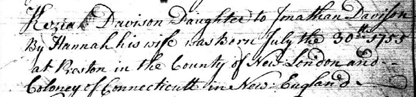 | Birth | She was born on 30 July 1755, in Preston, New London County, ConnecticutG.2,1,3 Birth record, Keziah Davison. |