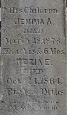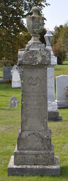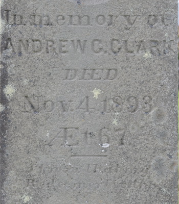 | Burial | He was buried on 7 November 1893 in the Peoples Cemetery, Mount Stewart, Queens County, Prince Edward Island, Canada, 46.36382, -62.84995G. In Memory of / Andrew C. Clark / Died / Nov. 4, 1893 / Æt. 67 / - / CLARKBack: His Children / Jemima A. / Died / March 28, 1873, / Æt. 11 yrs. & 6 Mos. / Kezia E. / Died / Oct. 24, 1864, / Æt. 1 yr., 3 Mths.5,2 Tombstone, Andrew C. Clark (1828-1893), his children Jemima (1861-1873) and Kezia (1863-1864). The Peoples Cemetery, Mount Stewart, Queens County, Prince Edward Island, Canada.  Front inscription detail.  Back inscription detail. |