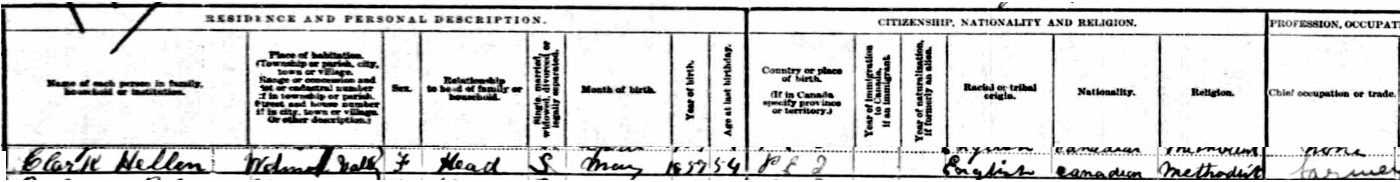 | Census | She was head of the household in the census in 1911 in Lot 25, Wilmot Valley, Prince County, Prince Edward Island, CanadaG. Helen (age 54) was living alone, on the farm adjacent to her brother Ewen. Helen never married.4 1911 Canada Census, Wilmot Valley, Lot 25, Prince County, Prince Edward Island. Household of Helen Clark. |